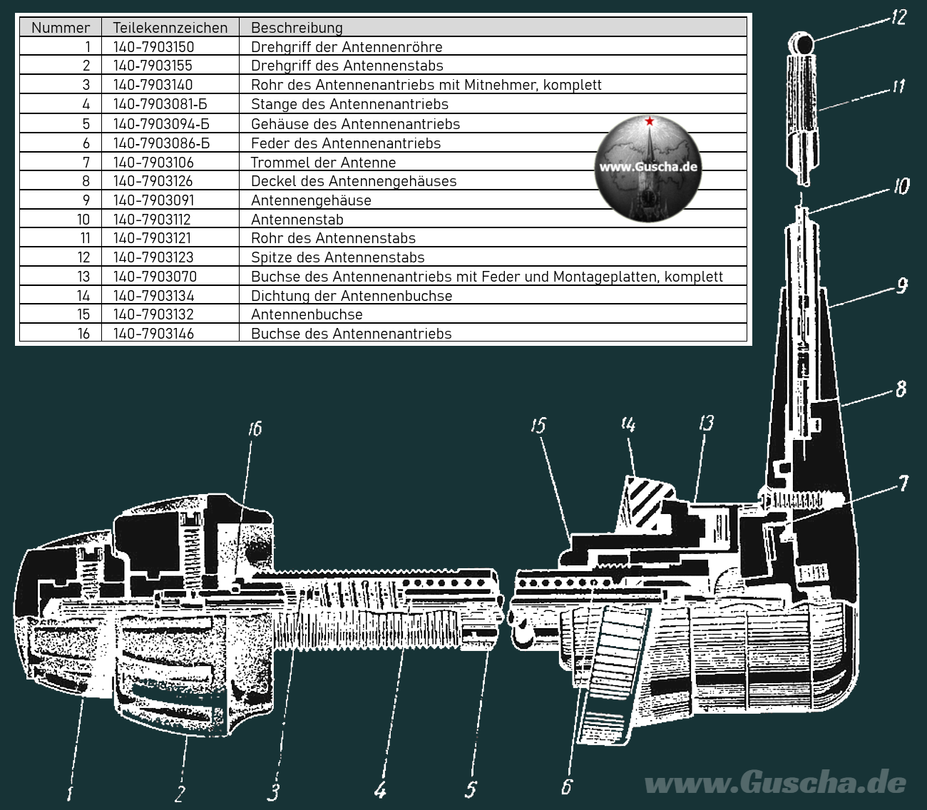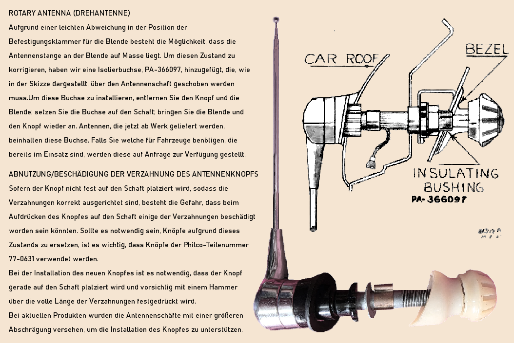 Bei Dachantennen, die mithilfe eines einzigen Knaufs von innen sowohl schwenkbar als auch aus- und einfahrbar gestaltet waren, handelte es sich um einen komplexeren und offensichtlich auch fragilen Mechanismus. Im Auslieferungszustand warnte der nebenstehend abgebildete Anhänger den neuen Besitzer vor dem Überdrehen des feinmechanischen Getriebes.